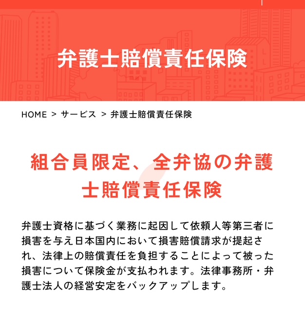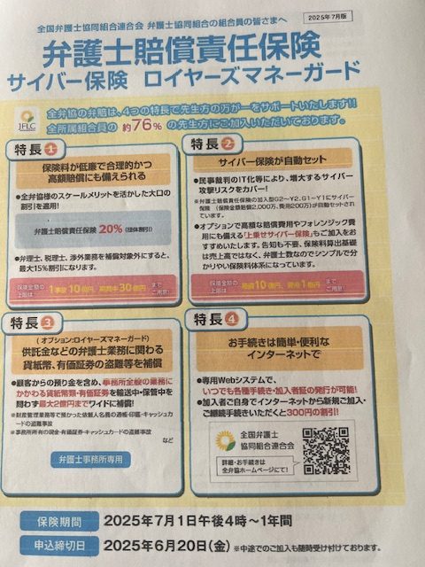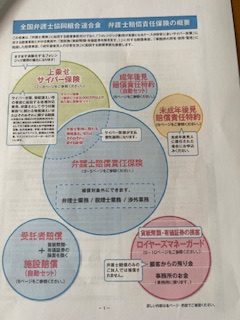 損保ジャパンの「弁護士賠償責任保険」のパンフレット。損保ジャパンの商品しかなく代理店も一社だけで細かい条件があります
